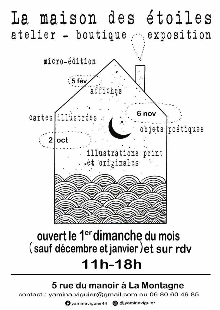 L’atelier Maison des étoiles vous ouvre ses portes chaque premier dimanche du mois, de 11h à 18h (sauf en décembre où je suis en salons à l’extérieur et en janvier). Vous pouvez venir découvrir mon travail, vous faire plaisir et/ou tout simplement me rencontrer…