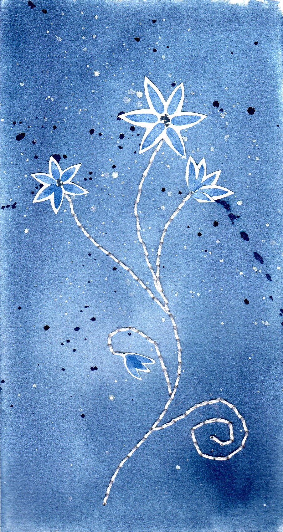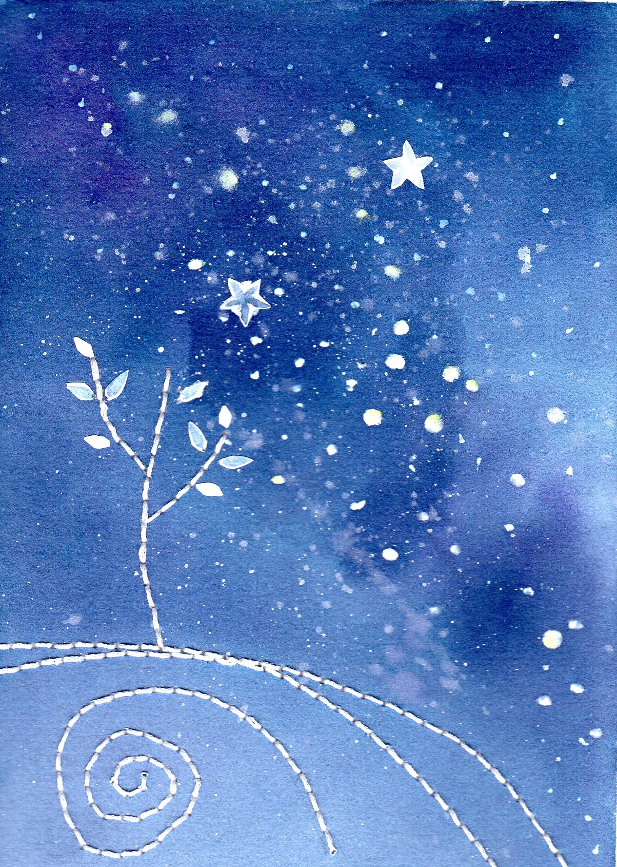 On sentait déjà dans la série bleue Indigo que les Spring flowers devenaient un peu étoiles dans le ciel… Un petit détour en résonance avec le verbe « croire » où le fil de coton revient parce que à petits points, à petits pas, il s’agit toujours de se mouvoir et s’émouvoir…
