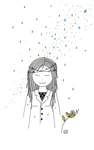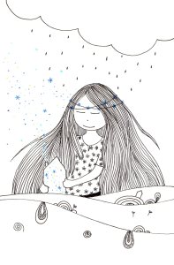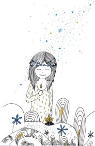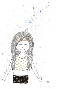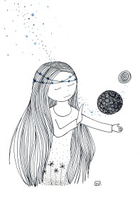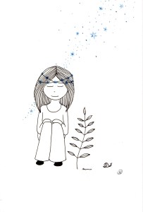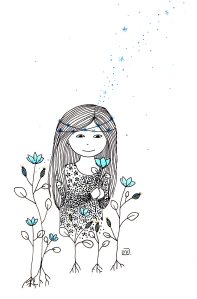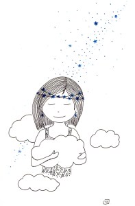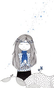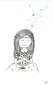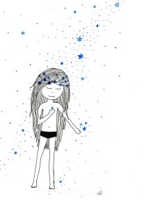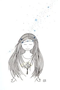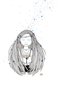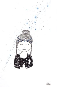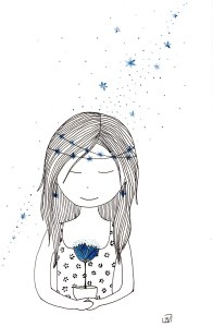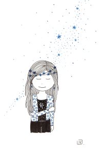 Être Fleur d’étoiles : illustrations aux feutres noir, or et bleu sur papier Canson 120 g.