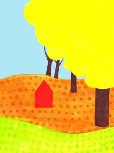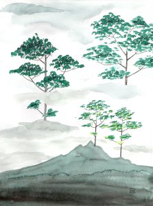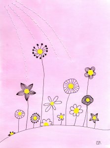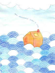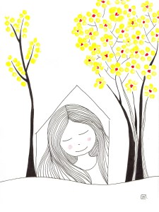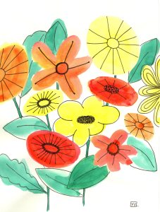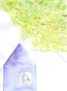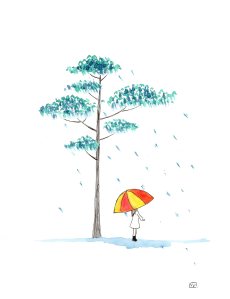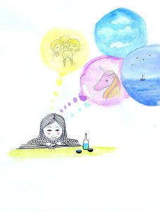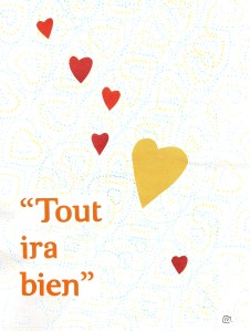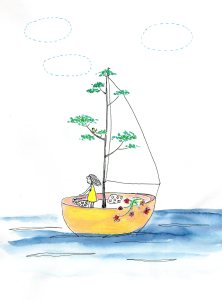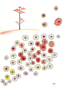 Journal de confinement (extrait) : pendant le premier confinement de 2020, j’ai réalisé chaque jour une illustration inspirée de mon état intérieur sur papier Canson 120 g. C’était un temps de création complètement libre, sans recherche de résultat. Techniques mixtes (aquarelle, crayons, feutres, pastels, collage, couture…). Format 18×24 cm.