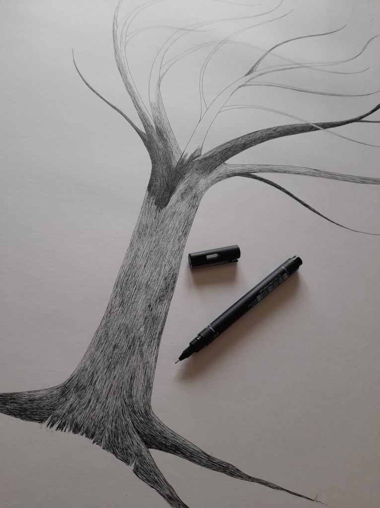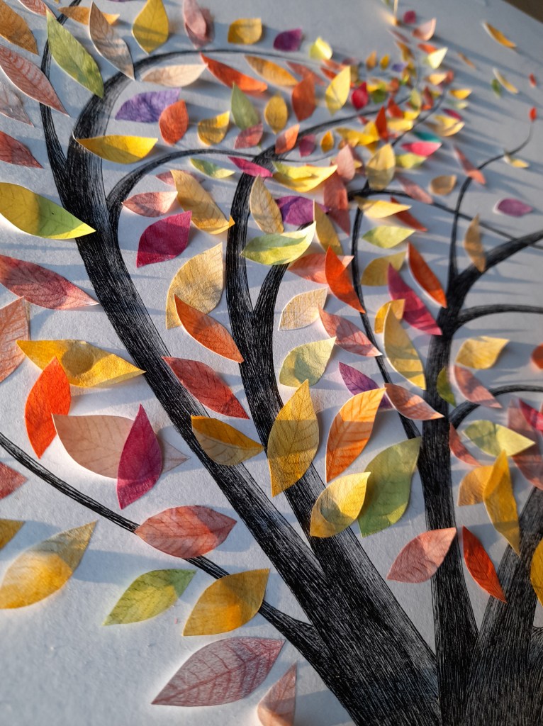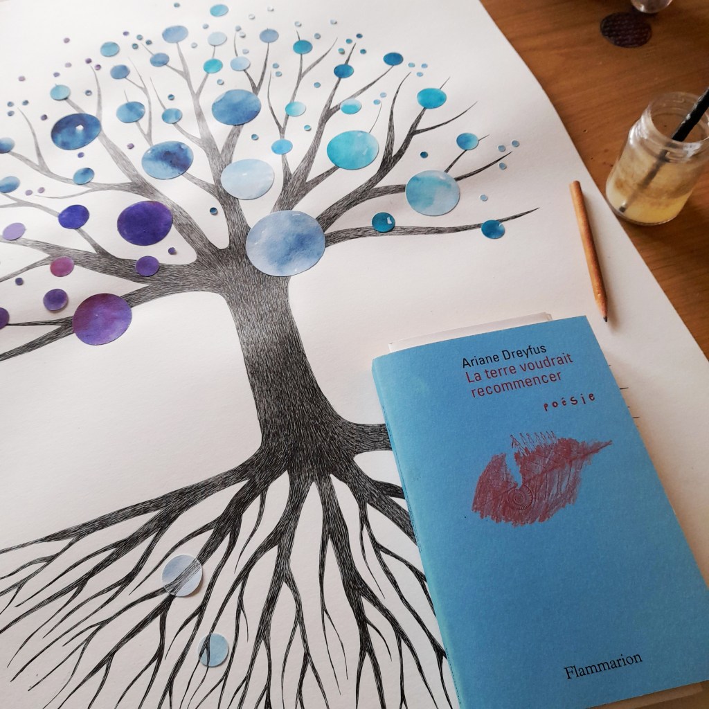 L’Arbre des mondes est née d’une rencontre et d’une envie de grand. La figure de l’arbre s’impose avec de plus en plus de force dans mon travail : l’arbre de Joie, l’arbre de vie, l’arbre-chevelure du personnage Hope… Ici, il est porteur des mondes, ceux habités, ceux imaginés, ceux perdus, ceux à naître dans ses racines…