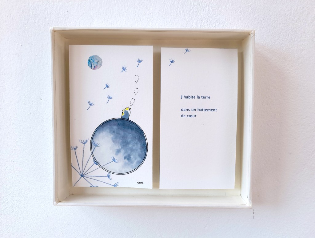 Une nouvelle « Petite forme poétique » ou « Poème illustré » a vu le jour dans l’été. Intitulée Habiter la terre, elle se compose d’une illustration originale réalisée au feutre, au crayon et à l’aquarelle et d’un poème, tous deux réunis dans un cadre de carton entièrement fait main.