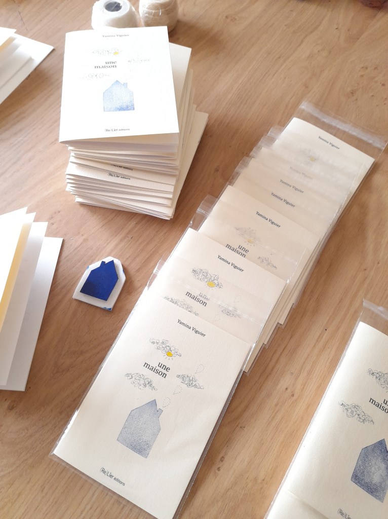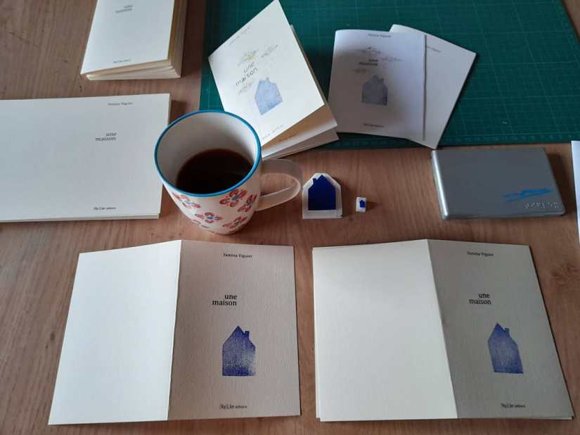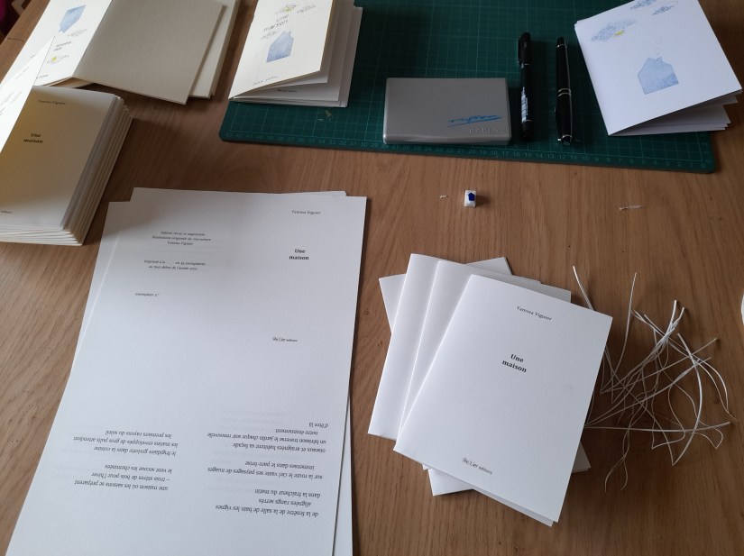 Ci-dessous, les étapes de fabrication : réalisation des couvertures, couleur, pliage des feuillets imprimés, tamponnage et numérotation de la dernière page, reliure agrafe, emballage. Il est prêt !