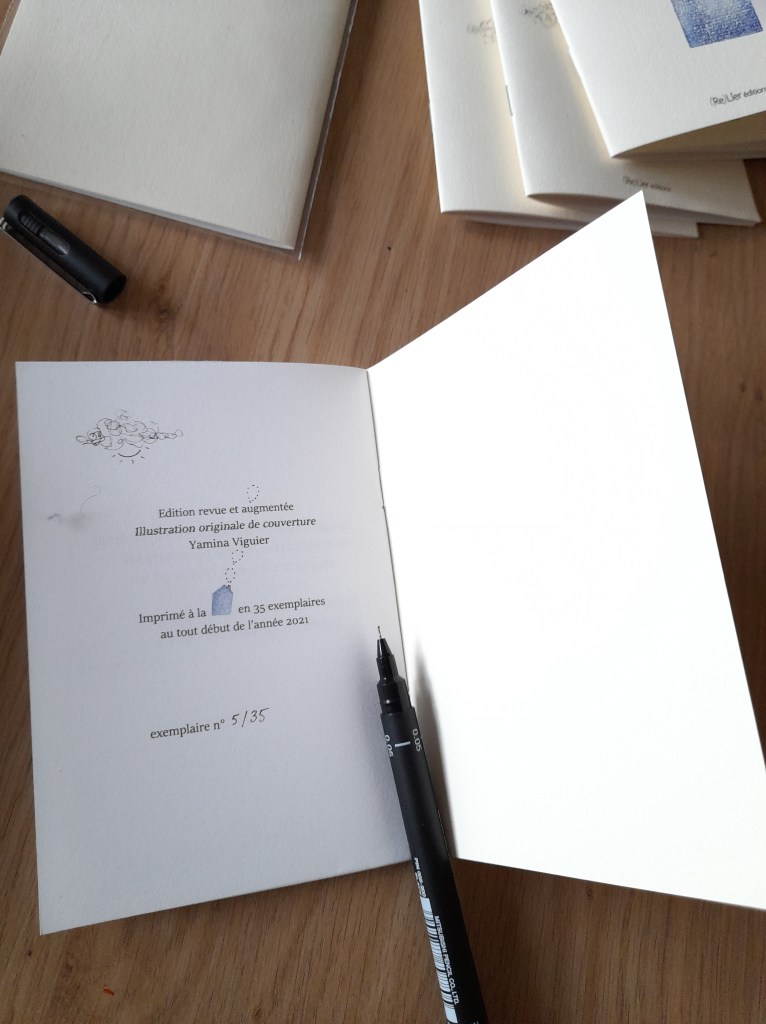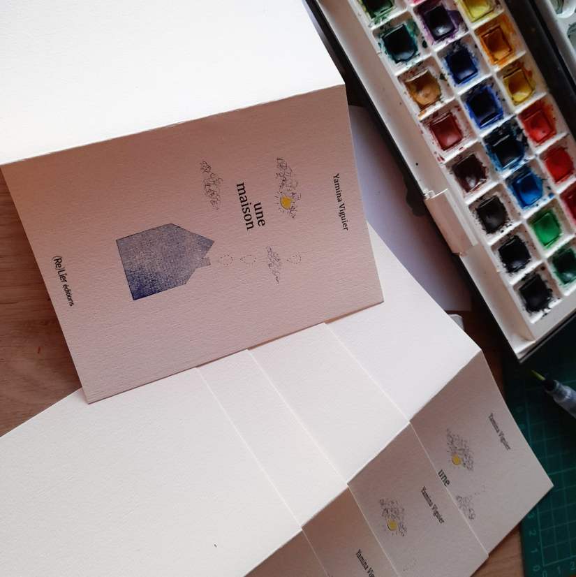8 pages imprimées numériquement sur papier blanc 125 g. Couverture en papier texturé blanc crème 250 g. L’illustration de la couverture est originale et donc unique pour chaque livre : tampon, dessin et aquarelle.